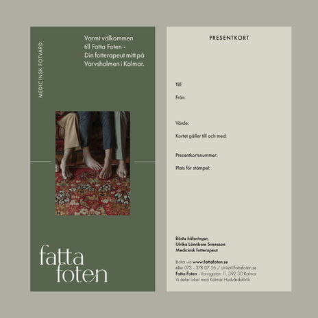 På Fatta Foten kan du köpa presentkort på valfri behandling eller summa till någon du tycker om eller som kanske redan har allt. Presentkort är giltiga i två år från utfärdandet. Kom in i butiken eller hör av dig på mail eller sms!
